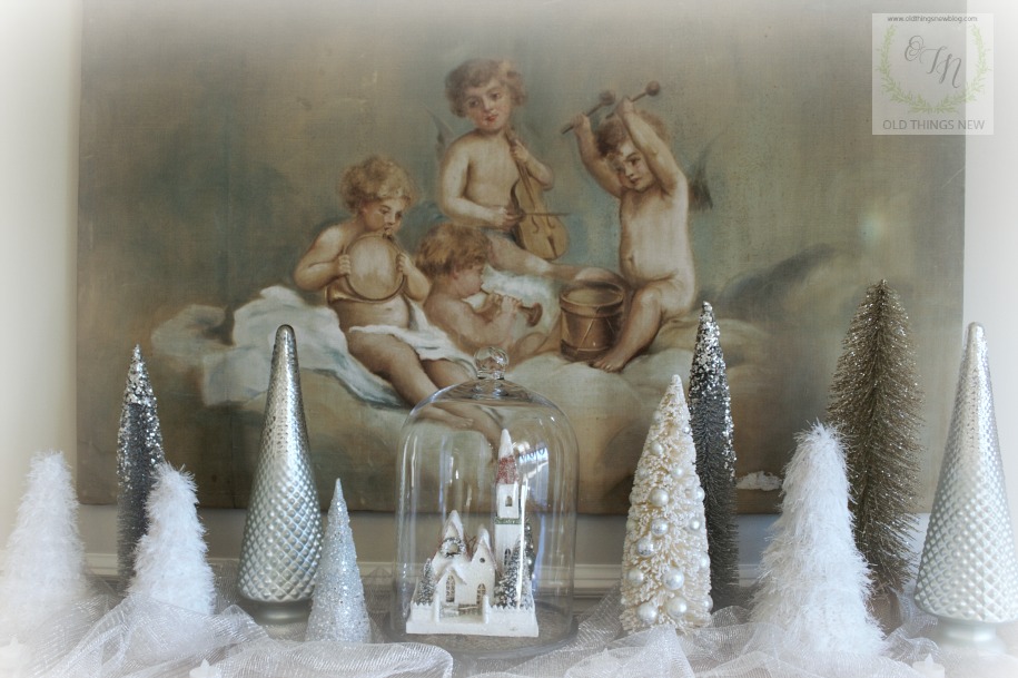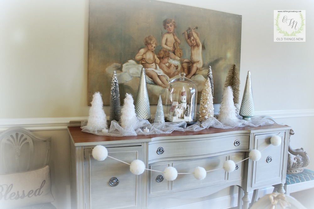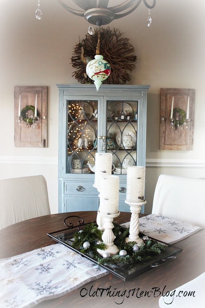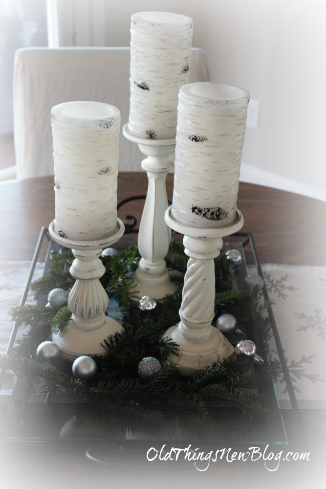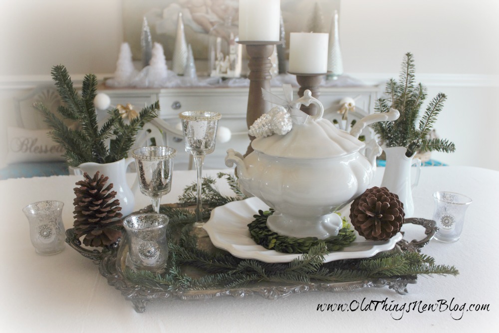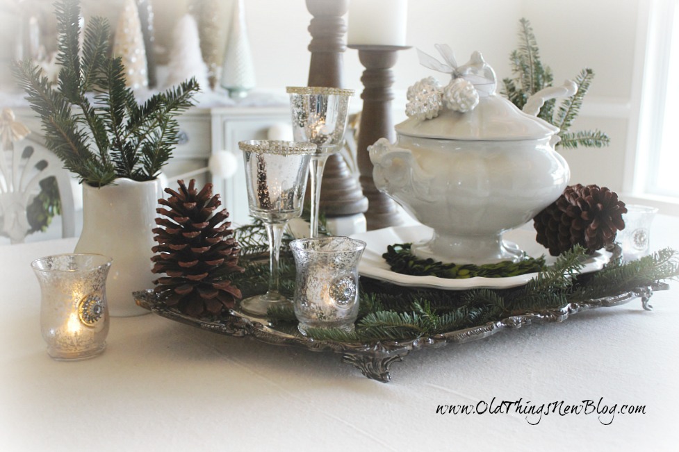 I did a natural centerpiece this year with fresh greens and pinecones on silver and white.
