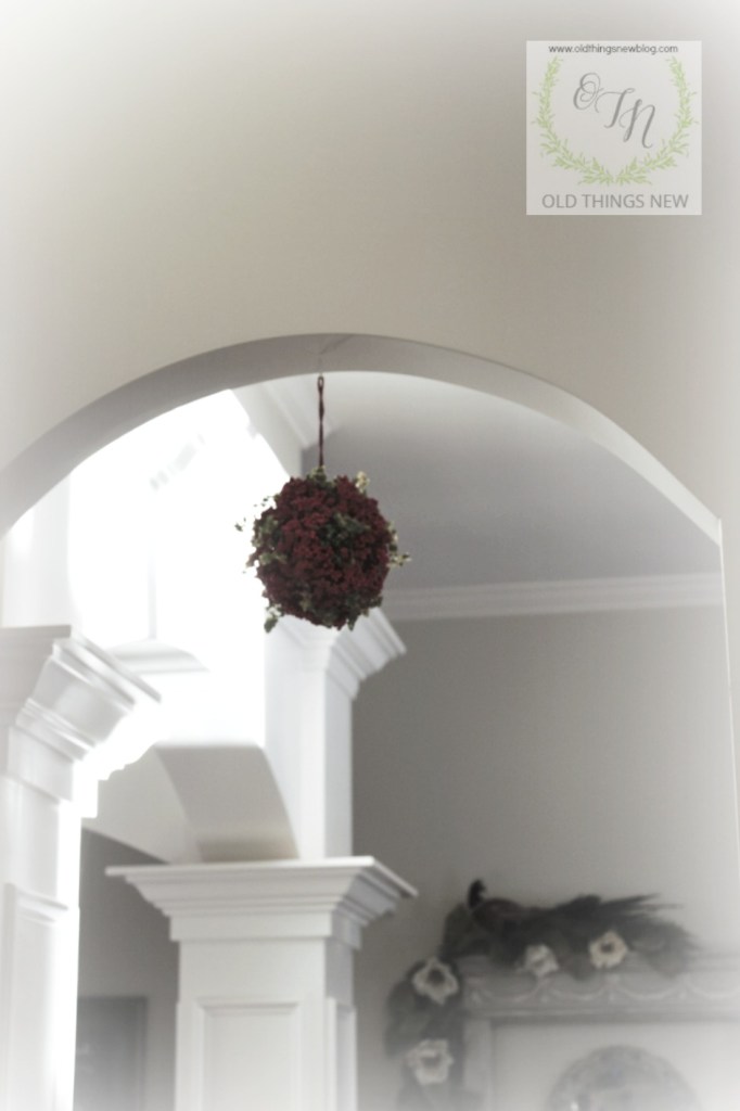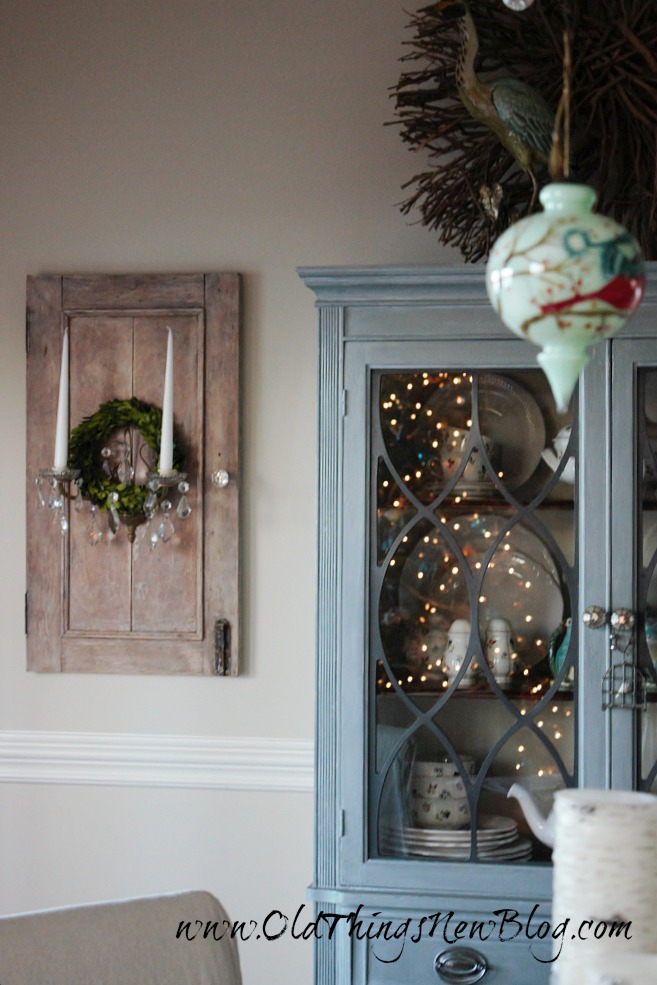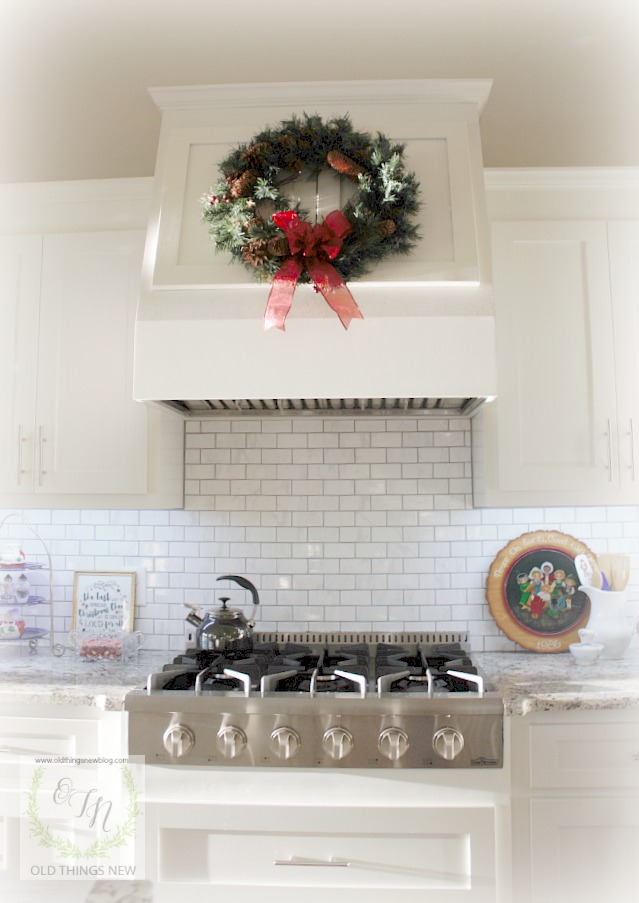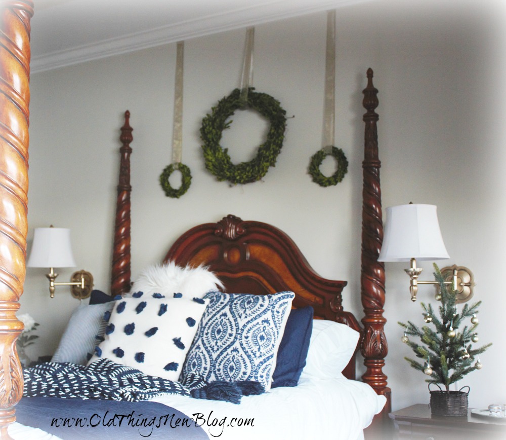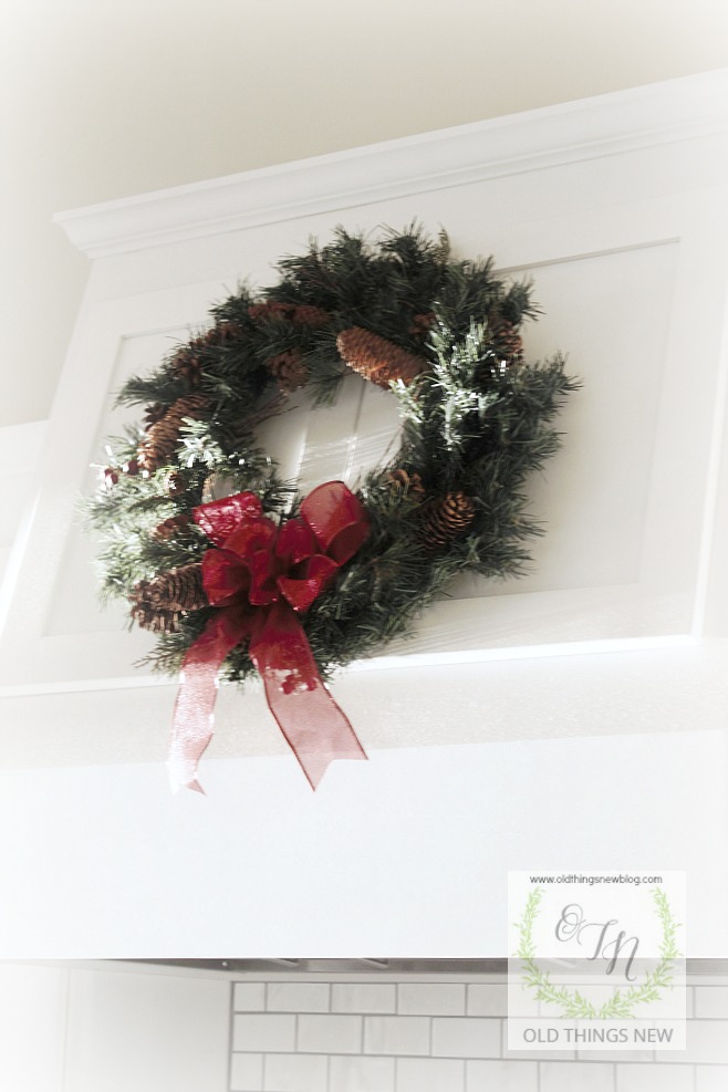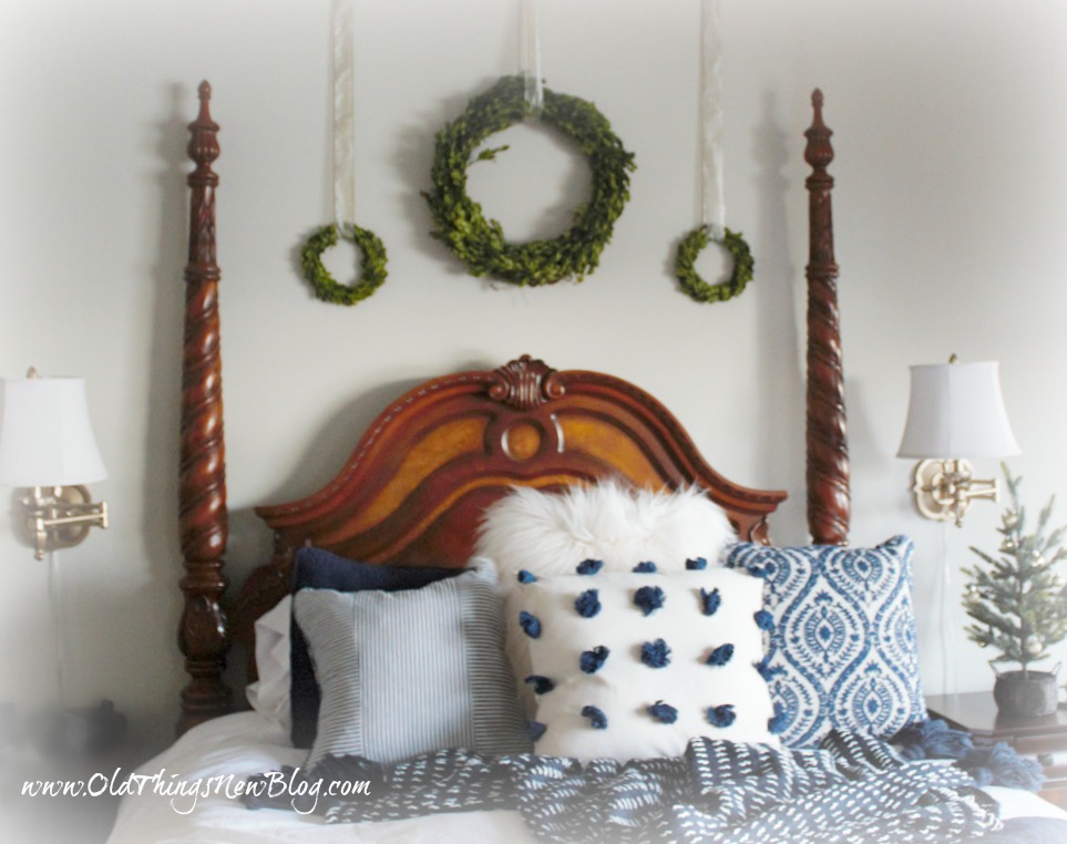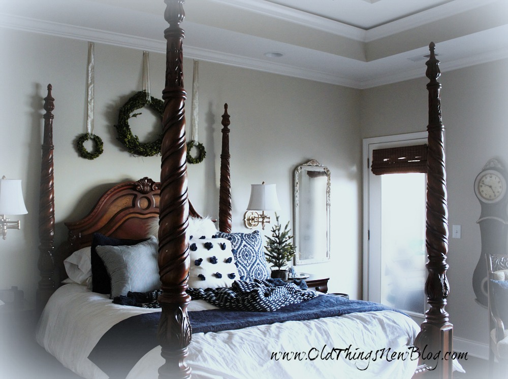 If you were to walk out onto the deck you would see another door which leads into our master bedroom. I haven’t added many Christmas decorations here. Only a small tree and three wreaths above the bed. By the way, you can also get to our bedroom from a hallway behind the kitchen. I didn’t want you to think we had to walk outside to go to bed 🙂