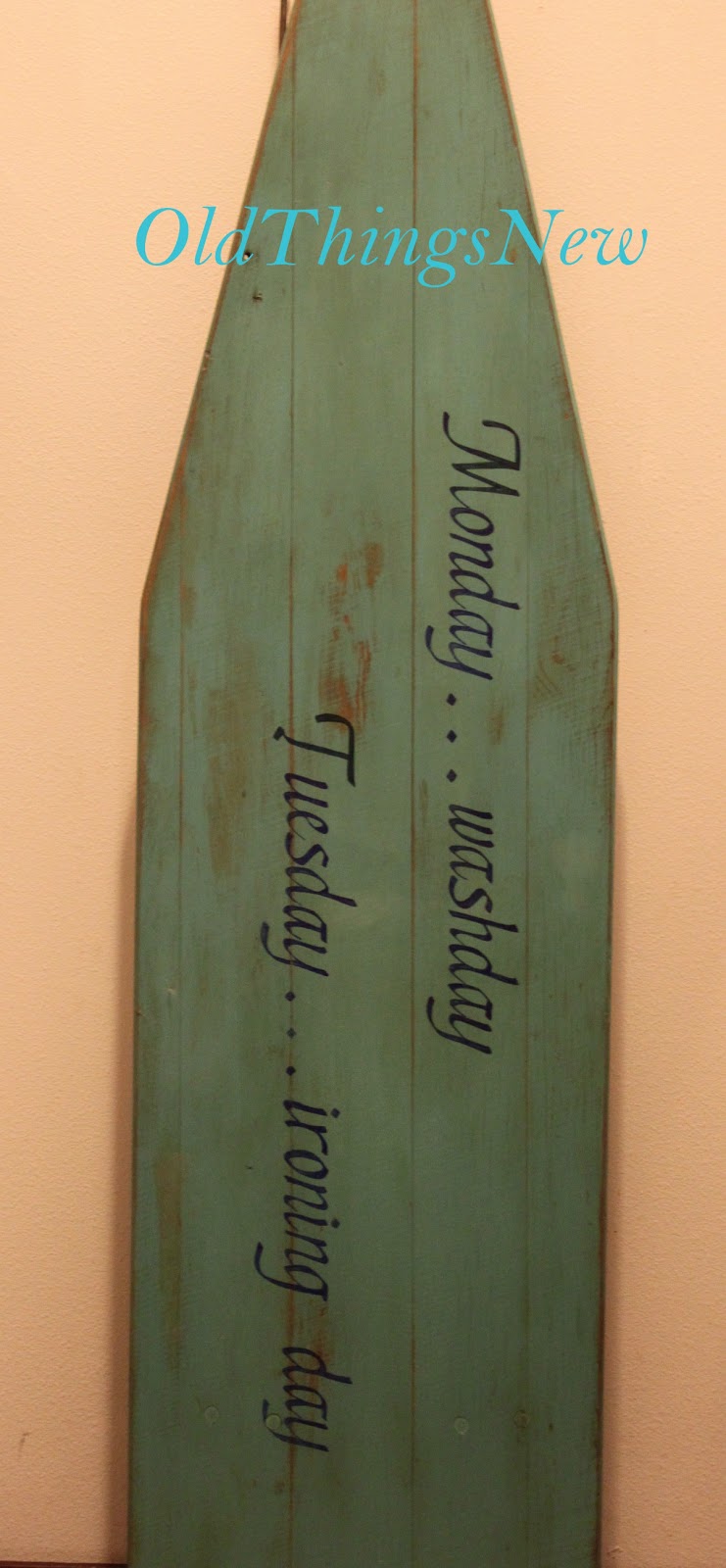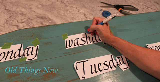 For my project I used only paper, a soft pencil, a ballpoint pen and a Sharpie. So, starting with the vintage ironing board that I previously blogged about, in “A Chalk Painted What?“, I set to work creating a phrase. For my mom, Monday was always washday and Tuesday was ironing day. Therefore . . .