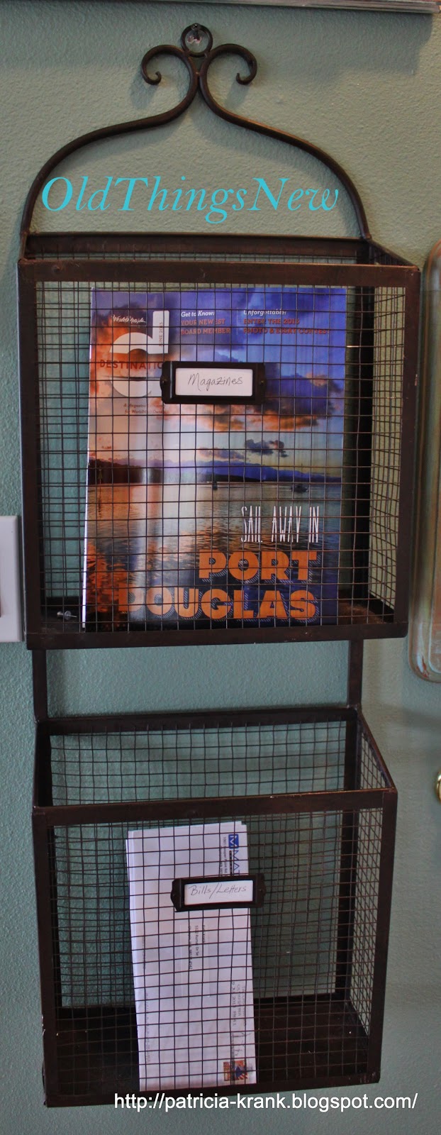 I purchased this wire mail organizer at Marshall’s for $12.99 and this is the piece that has really saved the day. I love the grand size of it . . . three feet tall . . . as it will hold a LOT of mail before I get around to organizing it. Magazines and large mail goes on top and envelopes on the bottom.