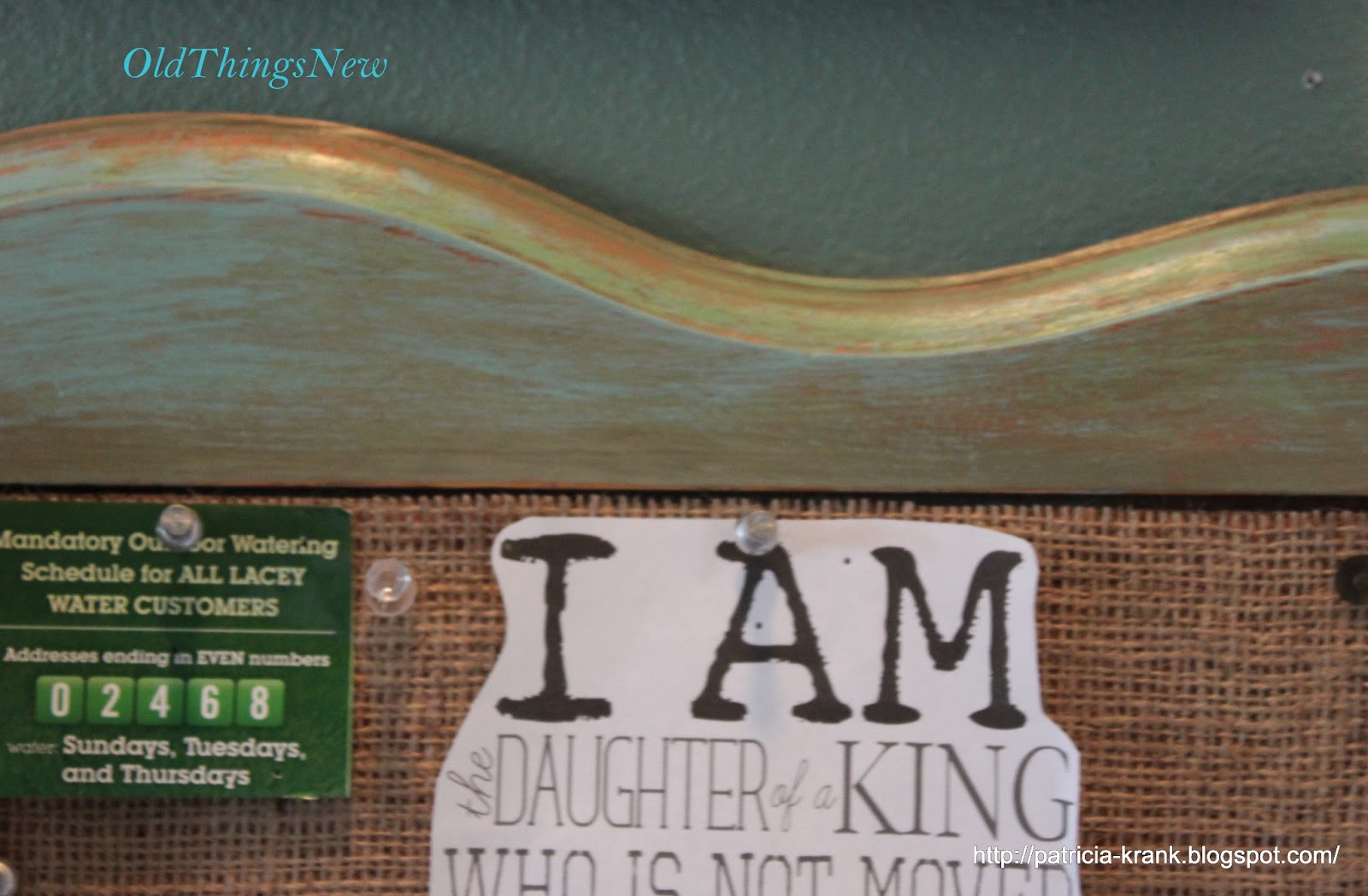Do you remember the popularity of golden oak? Mr. OTN had an entire office of golden oak. Desk, bookshelves, file cabinets, wall organizers . . . That’s what this piece was before a few layers of paint and some burlap over the cork.