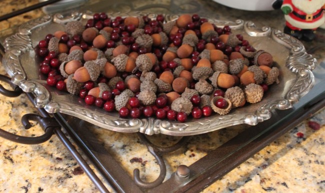 I did a natural centerpiece this year with fresh greens and pinecones on silver and white.