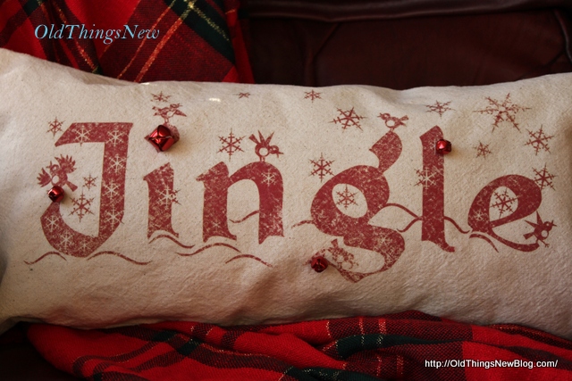 Pottery Barn catalog is one of my favorite sources for decorating ideas and inspiration for creating “one of my own.” Sooo . . . when the Christmas catalog arrived and I saw this cute little Pottery Barn “Jingle” Pillow the wheels in my head began turning. In no time at all I had created a new pillow that was much kinder to my budget than the $39.50 Pottery Barn price!