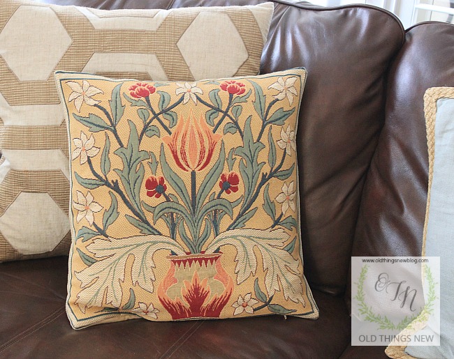 I recovered the old throw pillows we already had in this room with thrift store and drop cloth fabrics.